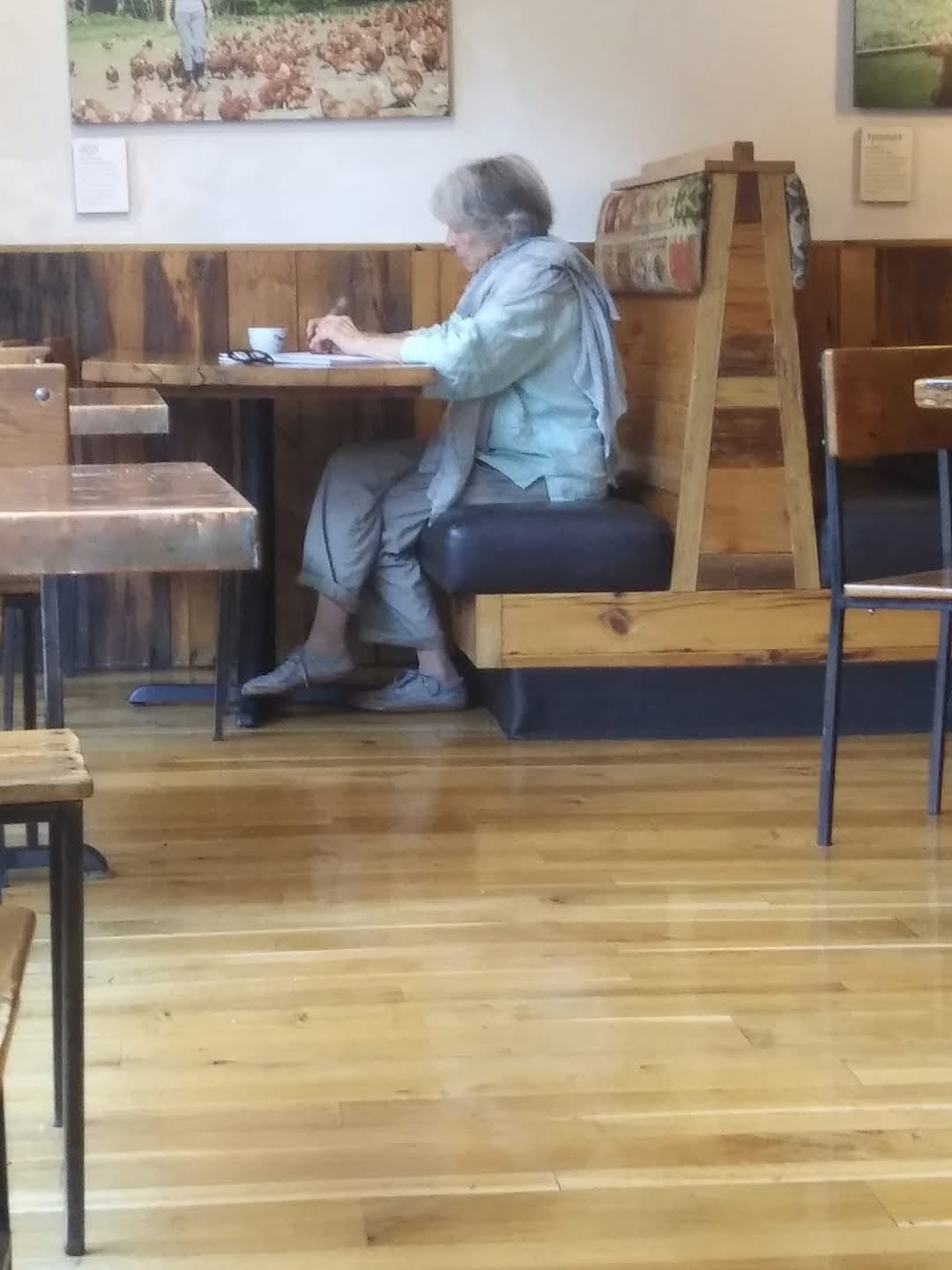 Perhaps that is why she is writing, longhand in a spiral bound book at the corner table.