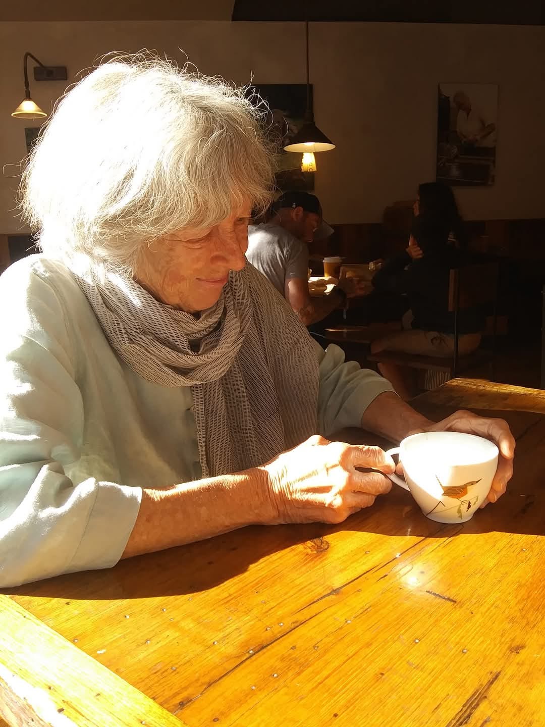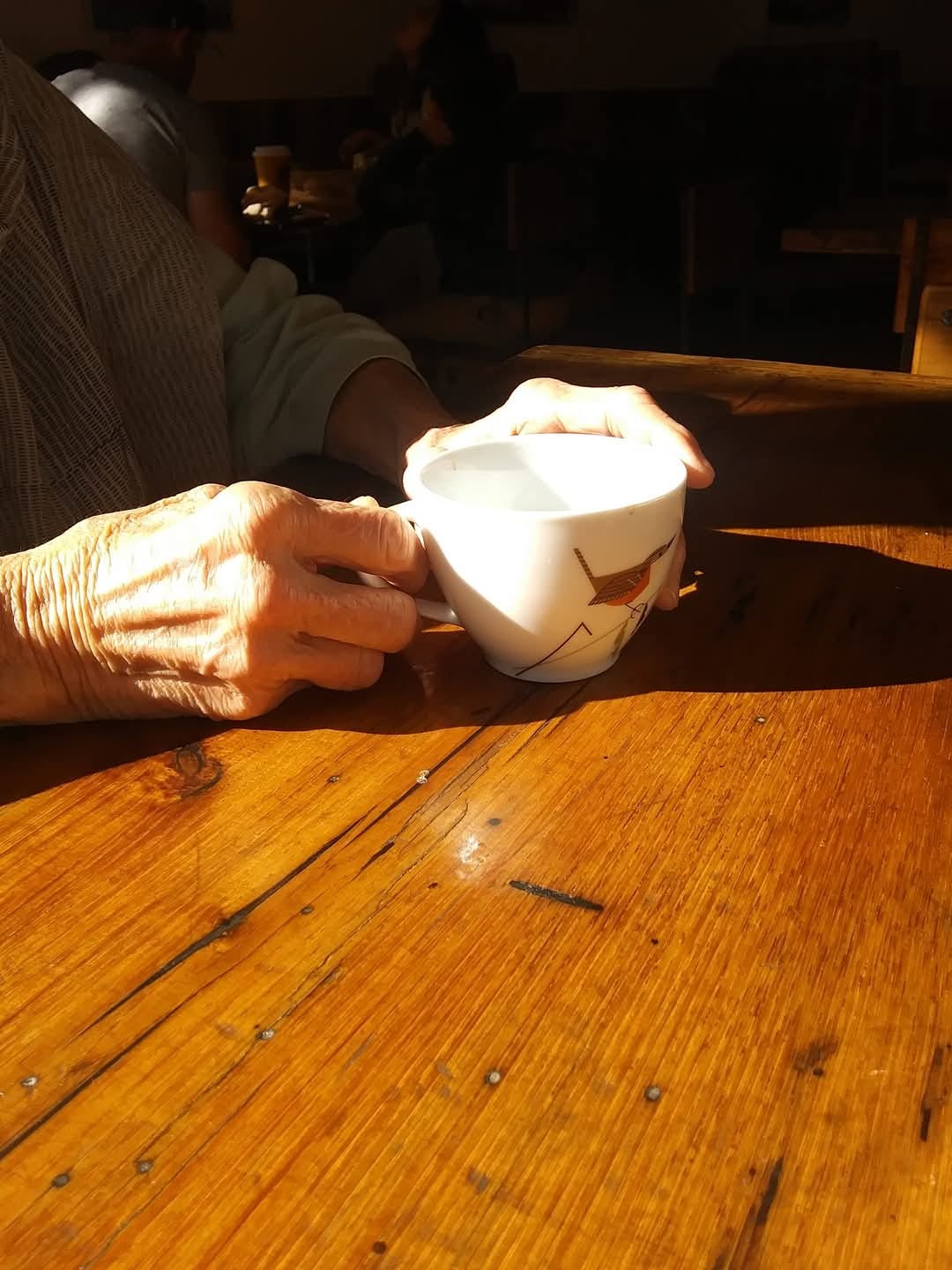 As she stands to leave, I gesture to the chair beside me. She mistakes my movement for a greeting and waves. She stops at the counter and turns to depart.