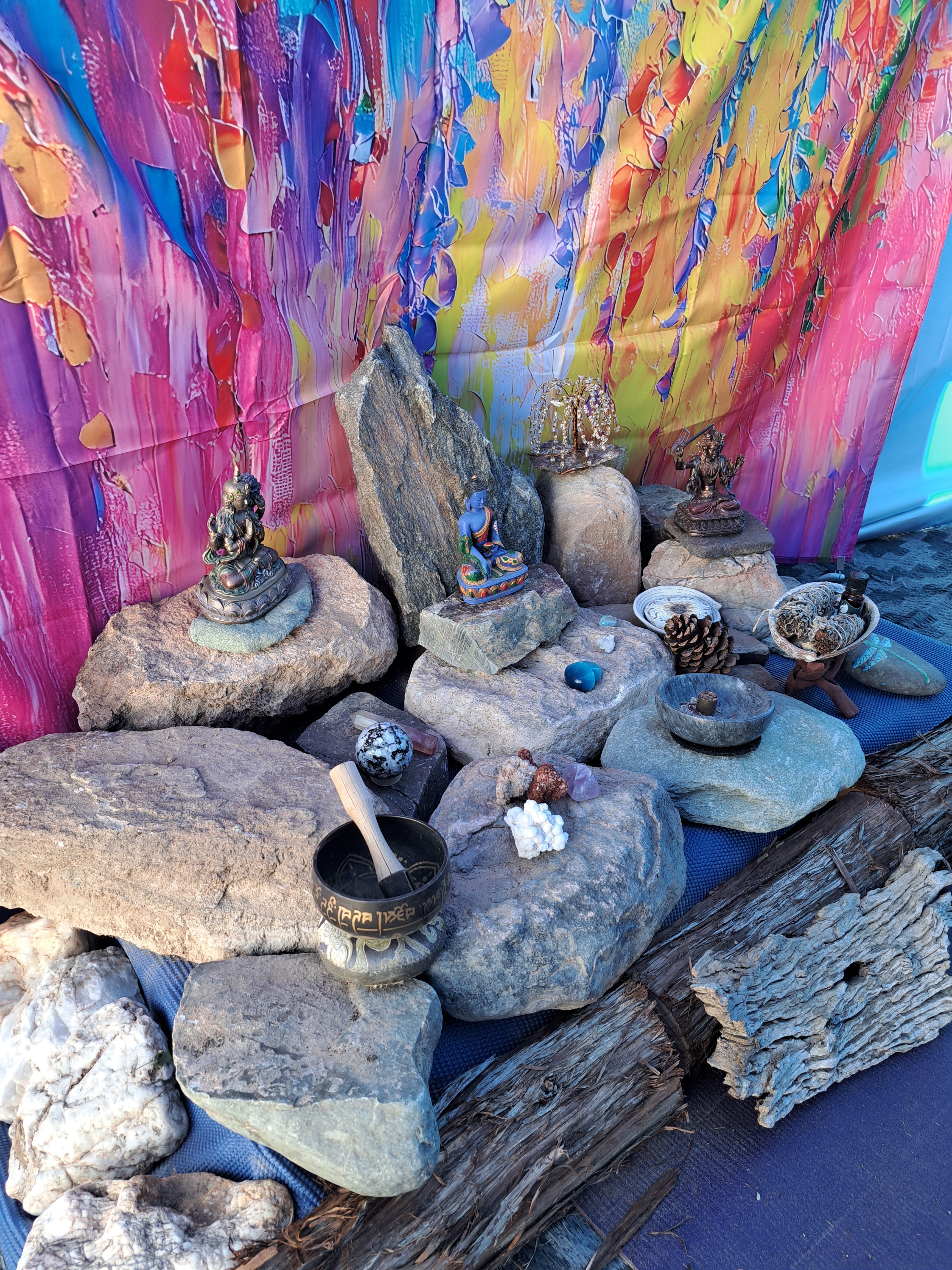 She is a dedicated student of Buddhism. She rises at 5:00 am for meditation. She studies via zoom meetings. There are several breakout face timing groups. For many months these requirements were met outside or in her van. Her beautiful outdoor altar was covered with sand.