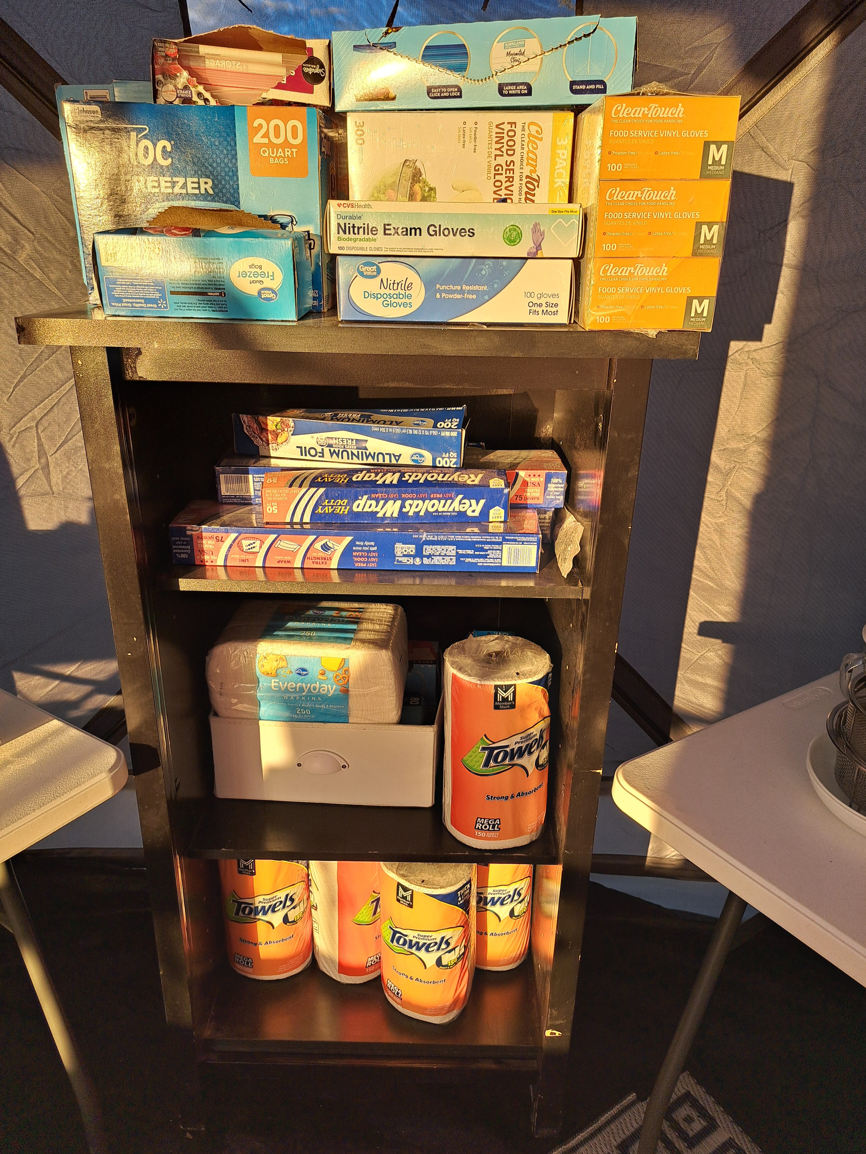 Until about a month ago, all that gear was jumbled in one tent and the tent also held the craft supplies of the very crafty Seren8y. (Sewing machines, ironing board, comfy chair, bolts of fabric)